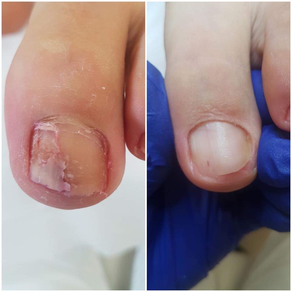 Podologas parenka individualų gydymą - specialiu aparatu nagas ploninamas, atliekama analizė, kuri nustato grybelinę nagų infekciją. Taip pat suteikiamos preparatų rekomendacijos, kurios minkština nago plokštelę ir daro jį elastingu.
