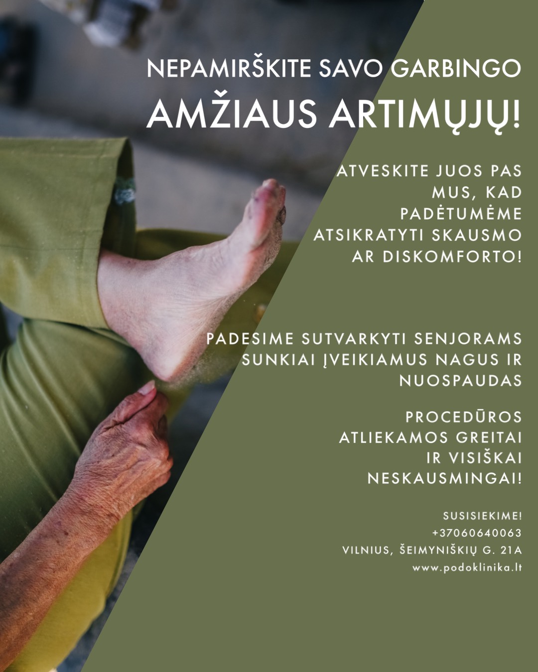 Jei suaugusio žmogaus pėdoms reikia nuolatinės priežiūros, tai pagyvenusių žmonių pėdoms reikia dvigubai daugiau priežiūros.